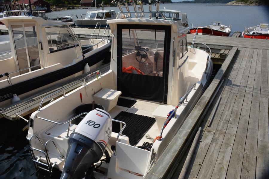 Insgesamt neun 23 ft. Dolmoy Boote mit Kabine, schnelles Pilothouse-Boot Dolmøy 23 ft. / 90-100 PS Außenborder, mit Echolot und Kartenplotter, GPS-Tracking zur zusätzlichen Sicherheit, geeignet für 4-5 Angler. Wochenpreis: 920 Euro.