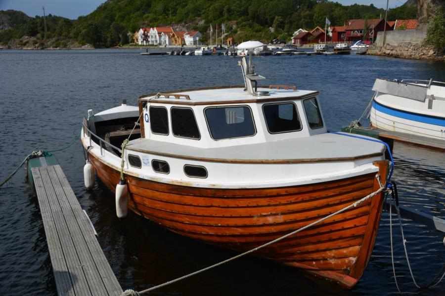 Angelboot 27 ft., Mandalsbaten, Kutter mit Kabine, 24 PS Diesel, geeignet für 7-8 Angler, mit Echolot und Kartenplotter, GPS-Tracking zur zusätzlichen Sicherheit, Wochenpreis: 780 Euro.